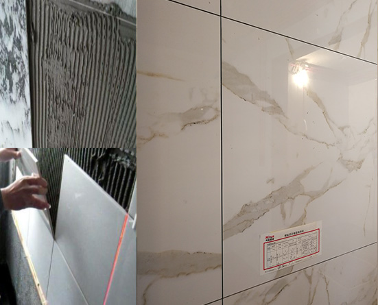 使用加強型瓷磚粘貼劑作為粘貼材料,確保粘貼牢固密實。鋪貼時用鋸齒鏝刀的直邊將瓷磚粘接劑在瓷磚粘貼面用力壓平涂抹一層,然后用鋸齒邊以夾角45°- 60°梳理瓷磚粘接劑,瓷磚粘貼面上梳理的瓷磚粘接劑條紋應與墻面上瓷磚粘接劑條紋的方向成十字交叉。保證瓷磚長期無空鼓不脫落、入住后的使用安全